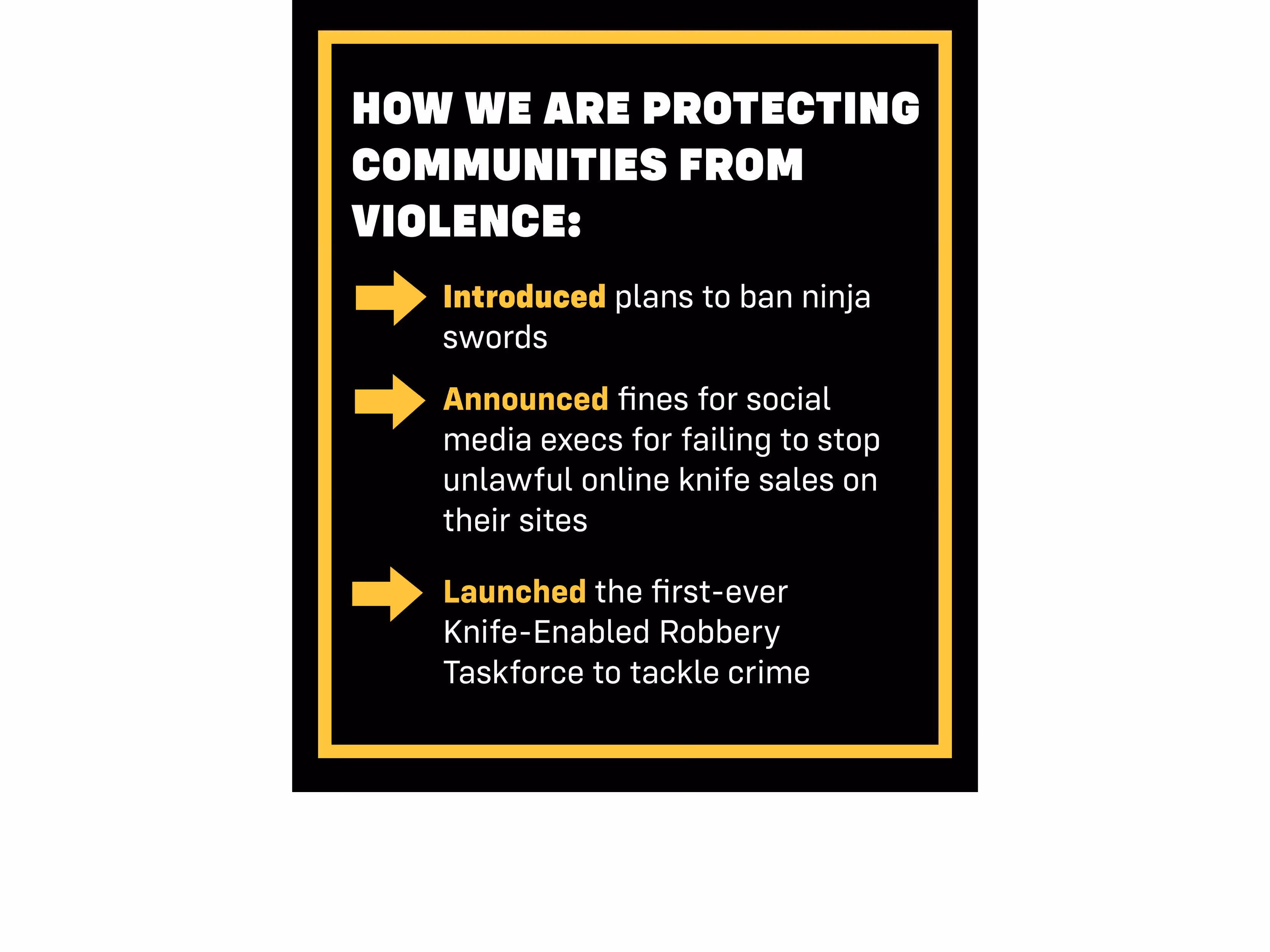 The government is also progressing its commitment to ban Ninja swords following a determined campaign by Pooja Kanda, the mother of Ronan Kanda who was tragically killed using one of these weapons in 2022. Today, it will publish a consultation to finalise the description of this deadly weapon – the first step towards bringing forward the change in legislation.