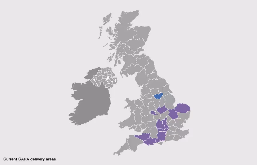 Since it was launched in 2011 in Hampshire, CARA has helped thousands of first-time domestic abuse offenders like Adam. More than ten years later it is delivered in nine police regions in England: In Hampshire, West Midlands, Dorset, Avon & Somerset, Leicestershire, Cambridgeshire, Norfolk, and Thames Valley it is delivered directly by Hampton Trust; in West Yorkshire we have partnered with Restorative Solutions to deliver CARA through our new licenced model for replication. This allows commissioned organisations with knowledge of their local areas to deliver CARA in their region with training, guidance, materials and quality assurance provided by Hampton Trust. (see image above)