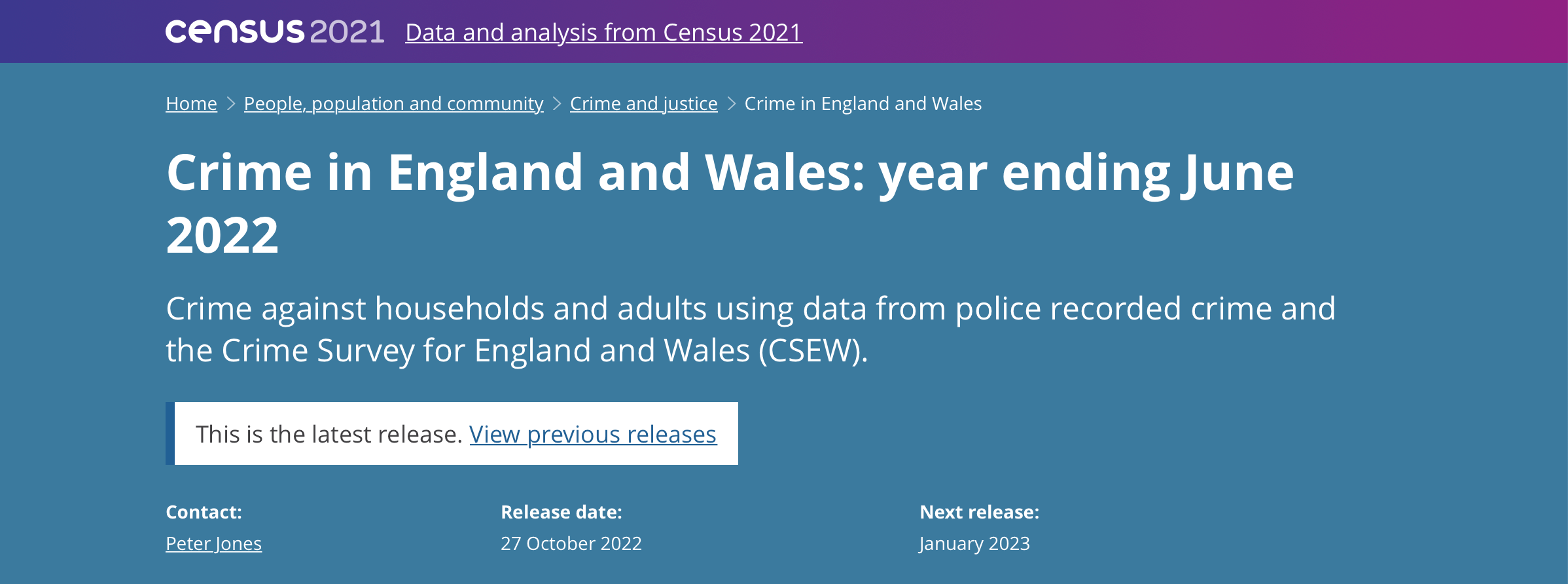 Crime against households and adults using data from police recorded crime and the new Telephone-operated Crime Survey for England and Wales. Includes the impact of the coronavirus (COVID-19) pandemic on crime and people’s perceptions of crime during the October 2020 to September 2021 interview periods.