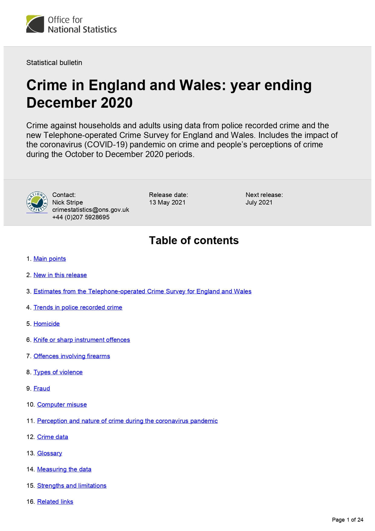 Crime against households and adults using data from police recorded crime and the new Telephone-operated Crime Survey for England and Wales. Includes the impact of the coronavirus (COVID-19) pandemic on crime and people's perceptions of crime during the October to December 2020 periods.