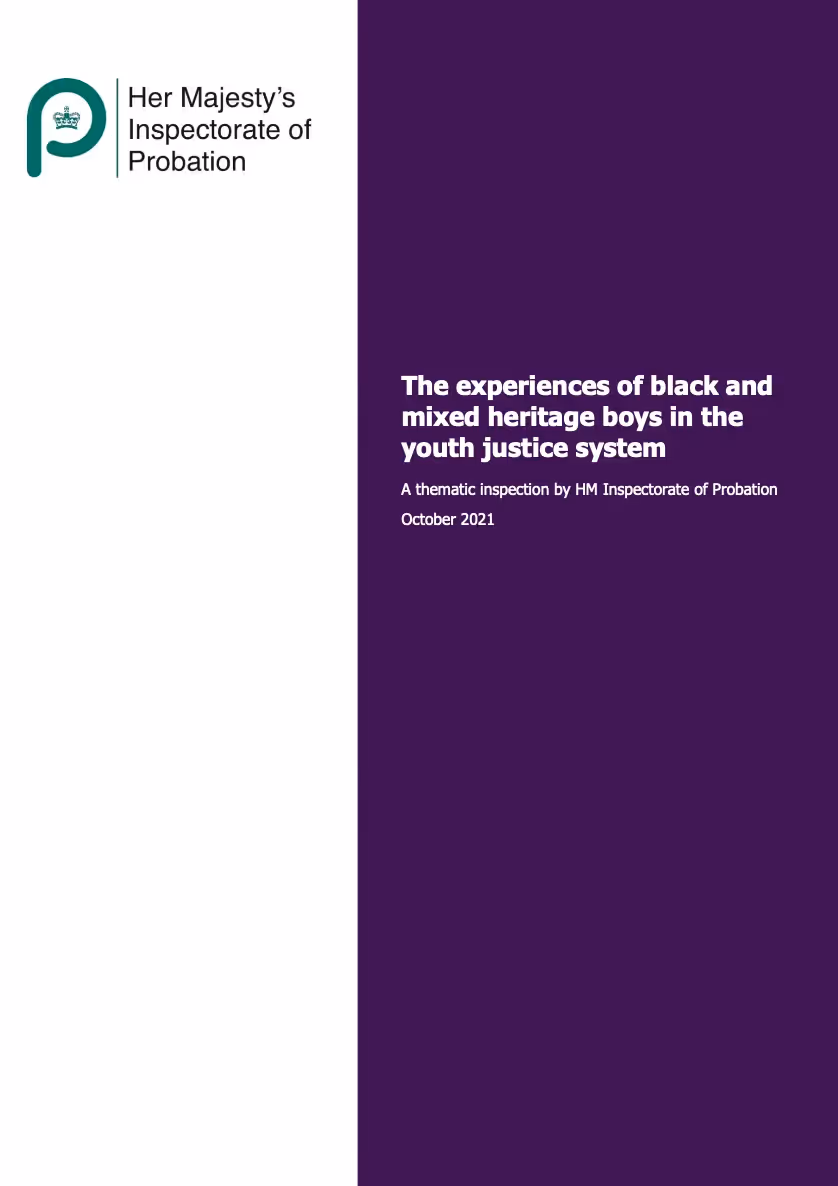 Thematic inspection of the experiences of black and mixed heritage boys in the youth justice system. Over the course of six weeks, nine different youth offending services (YOSs) were inspected. This included a review of comprehensive evidence in advance from each area and in total examined 173 cases of black and mixed heritage boys (59 out-of-court disposal cases and 114 cases dealt with by the courts). The services of ‘User Voice’¹ were commissioned to obtain the views of 38 boys who had been supervised by the different services. This resulted in understanding the support they had received and the challenges they face.