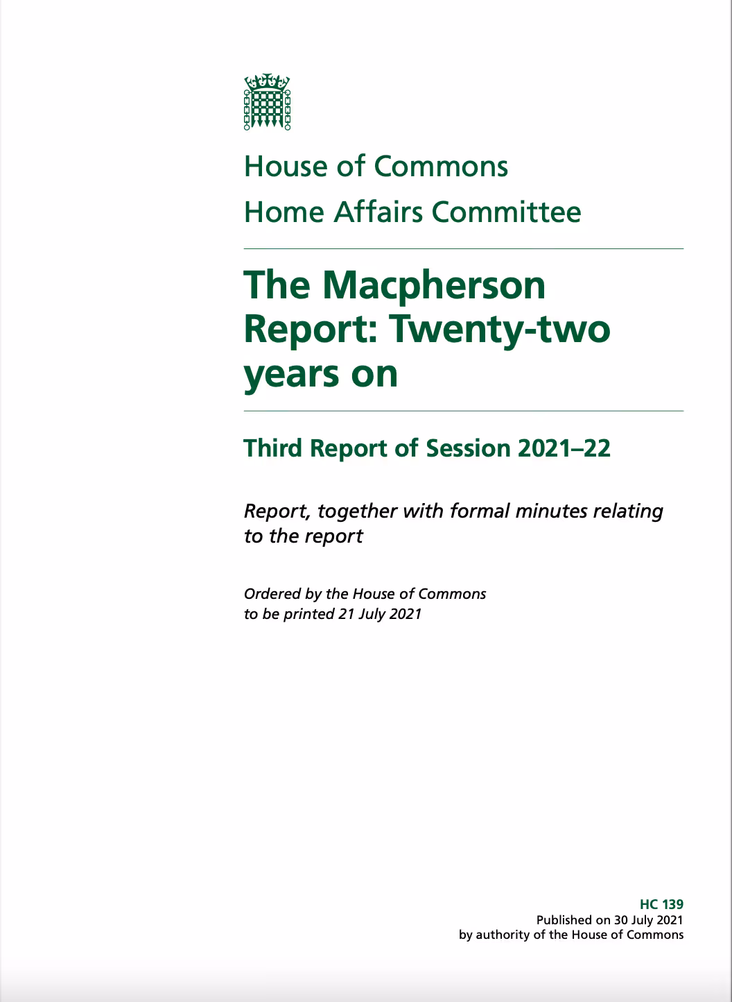 Assessment of the progress against some of the most important Macpherson report recommendations: on community confidence, on tackling racist crimes, on recruitment and retention of Black and other minority ethnic officers and staff, on race disparities in the use of stop and search and other powers, and on the overall aim set by the late Sir William Macpherson of “the elimination of racist prejudice and disadvantage and the demonstration of fairness in all aspects of policing.” We have also looked at the structures needed to deliver further progress today.