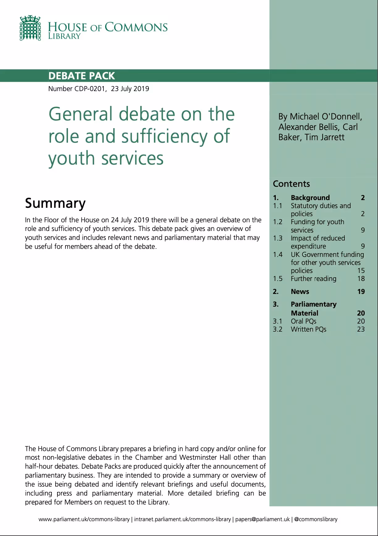 On 10 July 2019, the Government announced that it had launched a review of the guidance for local authorities which sets out how they should secure activities and services for young people. As part of the review process, “a public call for evidence will be open for 8 weeks over the Summer, from late July to September”.³